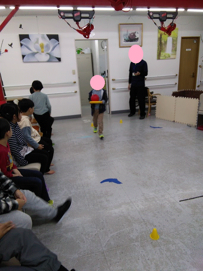 落とさないようにバランスを取りながら、コーンの周りを走る競争を行いました。