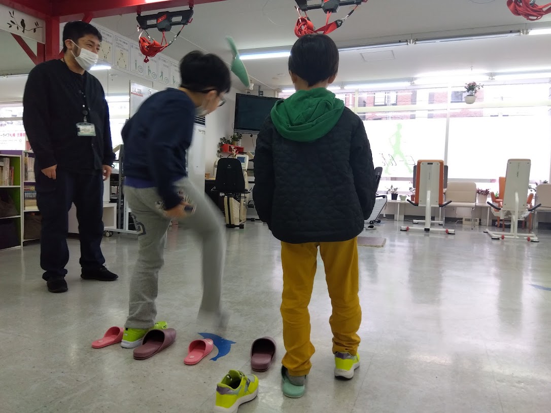本日の集団活動では、チーム対抗で「スリッパ飛ばしゲーム」を行いました。