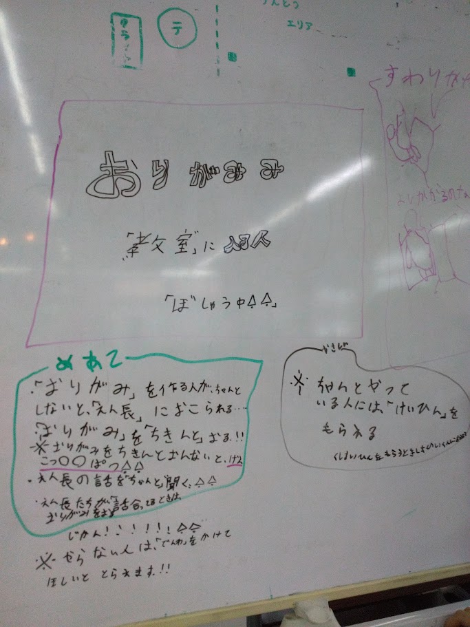 職員は生徒になりきり、園長先生から折り紙を教わります。