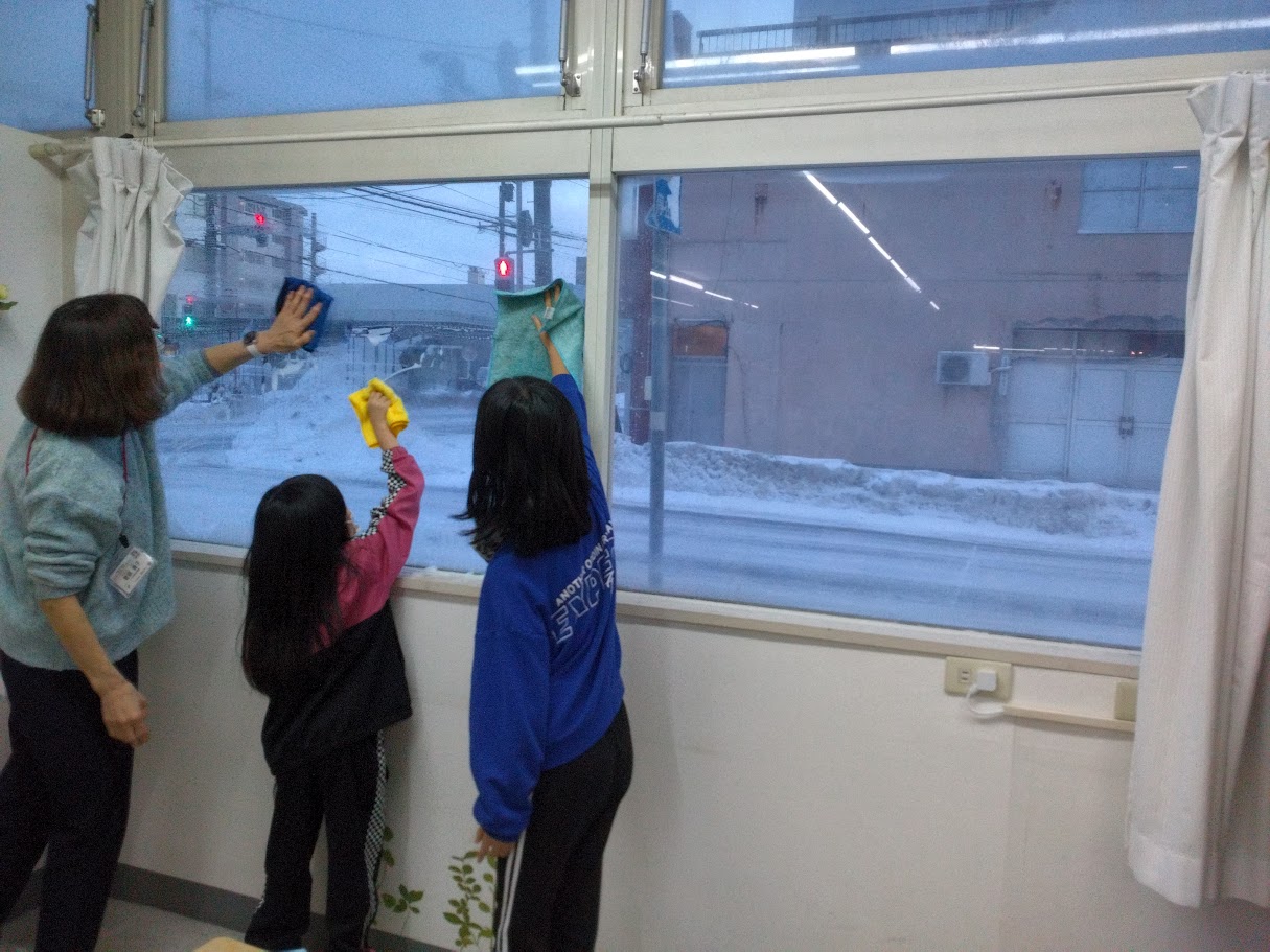 チーム女子は窓ふき担当・チーム男子は棚整理です。